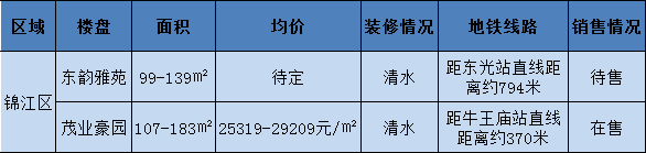 点评:锦江区的这两个楼盘都是清水房,东韵雅苑位于锦江区汇泉南路35号,目前价格还没有出来。容积率4.7。项目为高层、超高层塔楼。绿化率30%。容积率偏高,但优点是位置不错,300米处有二环BRT,临双地铁,距离地铁2号线牛市口站800米,距离地铁6号线东光站直线距离约794米,出行非常方便。(详情请戳链接:时隔8年,锦江区二环旁的上海东韵2期要开了?)茂业豪园在成都主城区的核心地段锦江区宏济新路618号,九眼桥的桥头位置。周边配套完善,旁边2站路就是春熙路,清水现房,预计今年12月份交房,户型是107-183平方米的大户型,想想总价,摸摸口袋!(详情请戳链接:踩盘 | 市中心神盘“换马甲”入市,可以买吗?)