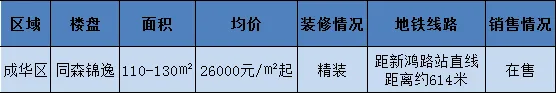 点评:同森锦逸位于成华区新鸿南支路9号,成华主城区,目前同森锦逸的高层已经全部售完,还有少量的125㎡的洋房在售,因身在老城区,小区周边环境一般,但是靠近公园,周边配套齐全,300多万元/套的洋房就看你喜欢不喜欢了。(详情请戳链接:二环内纯新盘即将上市,价格让人很纠结)
